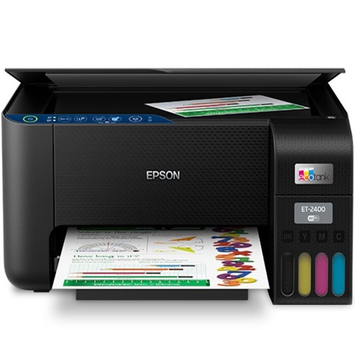 La Epson EcoTank ET-2400 es una impresora multifuncional inalámbrica 3 en 1 (imprime, copia y escanea) que destaca por su sistema de tanques de tinta recargables de alta capacidad en lugar de cartuchos tradicionales. Lanzada como una opción económica y ecológica, ofrece un ahorro de hasta el 90% en costos de tinta e incluye botellas de reemplazo que rinden hasta 4,500 páginas en negro y 7,500 a color. Cuenta con conectividad Wi-Fi para impresión desde dispositivos móviles mediante la aplicación Epson Smart Panel, una resolución de impresión de hasta 5760 \times 1440 dpi y un diseño compacto con tanques frontales que facilitan el monitoreo de los niveles de tinta.